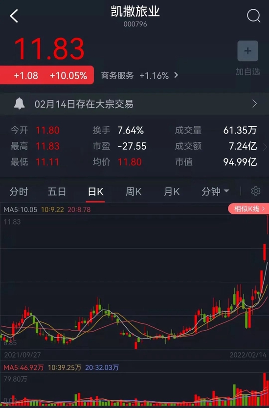 周一,住宿餐饮和酒店旅游板块一改往日颓势,表现出复苏反转的态势,板块涨幅分别为3.78%和3.72%。其中,华天酒店,凯撒旅业、西藏旅游、岭南控股、曲江文旅、国旅联合、正平股份等7只概念股集体涨停。值得注意的是,凯撒旅业已连续3个交易日涨停。