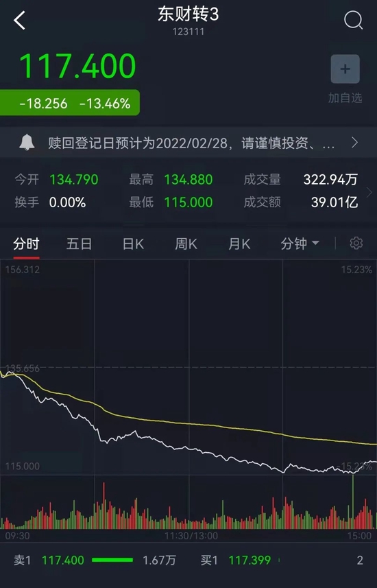 尤其是被称为“券茅”的东方财富,此前市值超3000亿元,今日早盘突然跳水,盘中一度重挫逾14%,引发了市场各方“关灯吃面”的热议。截至收盘,东方财富跌幅达13.36%,总市值缩水近441亿元至2850亿元。与此同时,其可转债东财转3也随之跳水,截至收盘跌幅达13.46%。