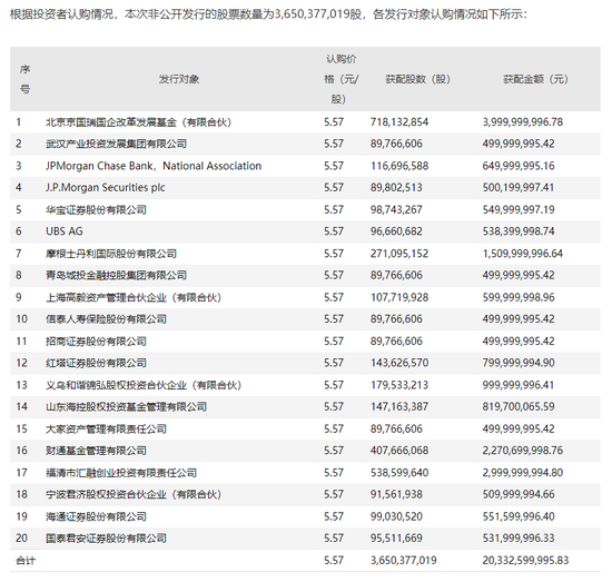 去年8月19日,京东方A百亿定增结果出炉,公司以5.57元/股的价格向信泰、大家等险资,高毅资产等私募,瑞银、摩根士丹利等外资,武汉产业投资等20家机构完成非公开发行股票36.5亿股,实际募集资金203.33亿元,扣除相关发行费用的实际募资净额约为198.7亿元。