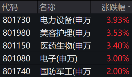 Wind数据显示,申万一级行业分类下,电力设备领涨两市,大涨3.93%。医药生物也涨超3%,达3.4%。“宁组合”和CRO概念股联袂上行。