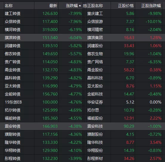 截至收盘,横河转债、傲农转债、晶科转债等多只可转债标的跌幅超过正股,旗滨集团、亚太股份、润建股份等正股上涨,可转债却大跌。
