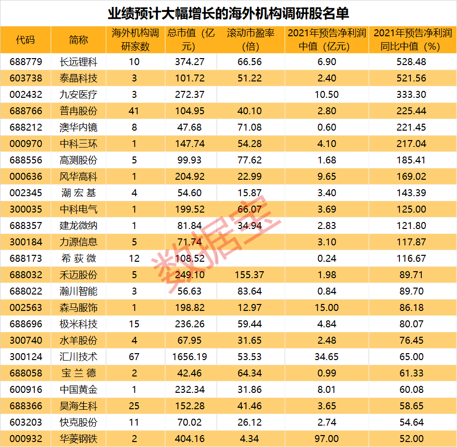 近期海外机构调研股出炉,多股业绩大幅增长。