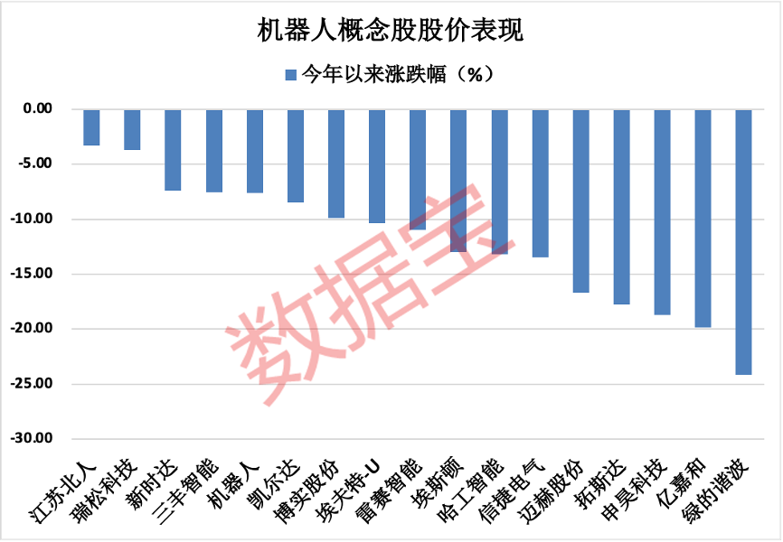证券时报·数据宝统计,今年以来,机器人概念股股价表现较平淡,申万17只概念股今年以来股价平均下跌12.11%,迈赫股份、拓斯达、申昊科技、亿嘉和、绿的谐波股价均下跌15%以上。