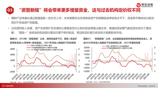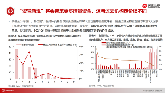 此时投资者会惊喜得发现,尽管中国市场看似经历了3年牛市,但是中国的价值股处在全球较低水平,自身估值分位数与相对成长股来看都极具性价比,甚至相对于国内以REITS为代表的可比资产中也有较高吸引力。遗憾却又庆幸的是,上述品种并不是过去机构牛市的偏爱品种,就如同2012年的TMT板块、2015年的食品饮料和2018年的电力设备一般。同时从增量资金的角度,理财净值化带来的“固收+”资金其偏好与股票型公募基金不同,它们已经体现出来了对于金融和周期性行业的偏爱。