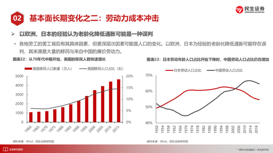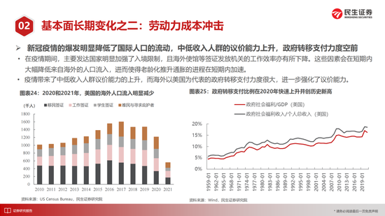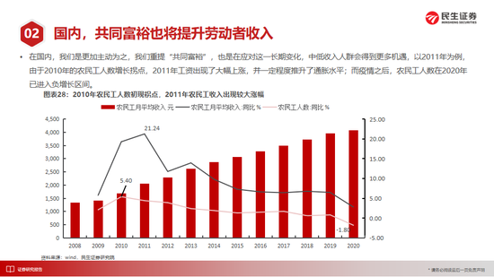 以欧洲、日本为经验的老龄化降低通胀可能存在误判,其压低通胀的重要力量正是大量移民与来自中国的廉价劳动力。以美国为代表的发达国家已结束了劳动人口的增长,而疫情加速了移民减少的过程,中低收入人群提升“议价能力“的意愿被政府转移支付所点燃。中国以及其他市场同样面对这一问题:甚至大宗商品也在隐含这一逻辑,我们可以将其理解为对于资源国劳动人口薪资的支付;在国内,我们是更加主动为之,“共同富裕”也是在应对这一长期变化,2011年,农民工工资在农民工人数增速的向下拐点后加速上升,而近期农民工人数已经进入了负增长的区间。我们有理由相信,2016年以来的收入分化需要更多调整,中低劳动力需要在增长中获得更多分配。