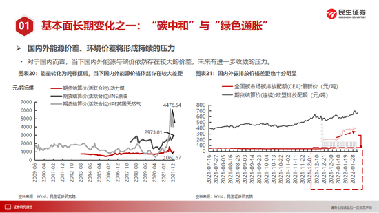碳中和并非只是“限电限产”与“能耗双控”,而是将有限的资源在中期视角(2022-2030)内分配给了相对低效的能源(尽管新能源全生命周期或许具有经济性并在长期降低持续性风险的能力,但是短期维度的低效仍是事实)。在传统行业已经进入高产能利用率并天生具有自然枯竭的特征下,上述现象将对潜在产出和通胀压力形成长期冲击。上述矛盾并不是简单的“放开和保供”可以解决:放开集中在中游领域,其实在增长潜在能源消耗;保供核心都在于”提升产能利用率“,而并未解决产能上投入的问题。现实情况是,股权、债权融资成本的差异与确定性的愿景已经改变,而碳中和的临近无法支撑部分能源的回收周期,而限价政策会降低产能上缓解上述矛盾的可能。而能源问题的全球属性,也意味着能源价差、环境价差将对国内形成持续的压力。