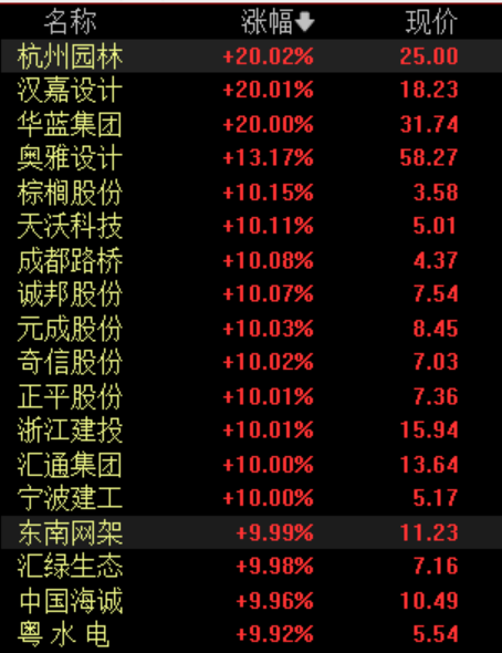 浙江建投所在的建筑装饰板块也掀起了涨停潮,其中,杭州园林收获连续两个20cm“大号”涨停板,正平股份则实现五连板。