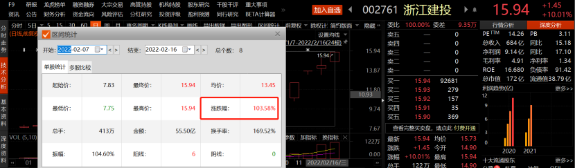浙江建投春节后八个交易日录得七个涨停,股价累计涨幅高达103.58%,成为虎年首只翻倍个股。