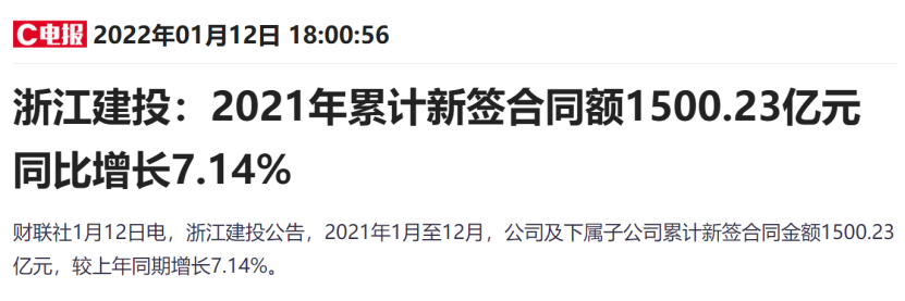 浙江建投日前披露四季度主要经营情况公告:2021年第四季度,公司及下属子公司新签合同金额为人民币369亿元,全年累计1500亿元,同比增长7.14%。