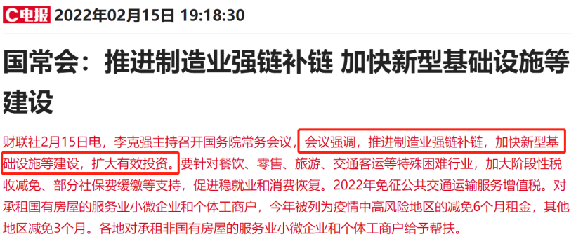 消息面上,国务院常务会议强调,加快新型基础设施等建设,扩大有效投资。实际上,在适度超前开展基础设施投资的背景下,2021年12月中旬,财政部向各地提前下达1.46万亿元2022年新增专项债额度。春节假期结束后,湖北省、福建省、陕西省等多地已经举行省级重点建设项目集中开工仪式。“基建”也成为近期新闻联播的热词。