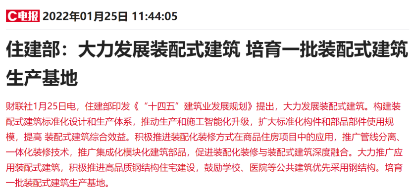 住建部近日印发《“十四五”建筑业发展规划》,其中一项内容提出大力发展装配式建筑,提高装配式建筑综合效益。