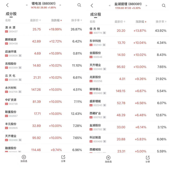 锂电池产业链表现抢眼,盐湖提锂板块中,倍杰特涨逾13%,东华科技、金圆股份、天齐锂业涨停,兆新股份、赣锋锂业、盛新锂能、西藏矿业等大涨。锂电池板块中,清水源20cm涨停,鹏辉能源涨逾12%,启迪环境(维权)、吉翔股份、云天化、中矿资源等多股涨停。