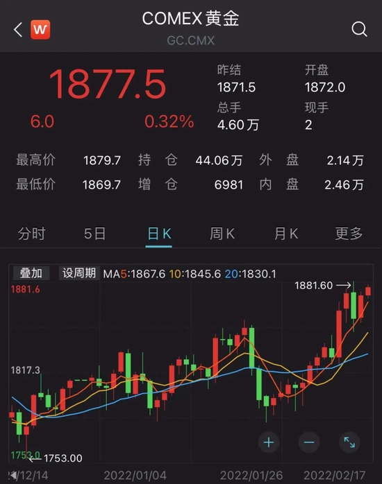 今日地缘政治局势反复,黄金期货价格继续上涨,截至16时,COMEX黄金上涨0.32%,报1877.5美元/盎司。