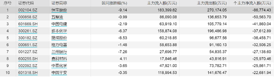 今日主力资金净流出金额前十股