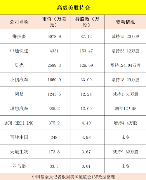 根据美国证监会披露的13F持仓数据,到2021年四季度末,高毅的美股持仓市值超1.61亿美元(约合人民币10.20亿元),较上期略微下降,其前三大重仓股分别是拼多多、中通快递、贝壳,高毅还增持了小鹏汽车、理想汽车等,但减持了天境生物、网易等,清仓了新东方、好未来、微博等多个标的。