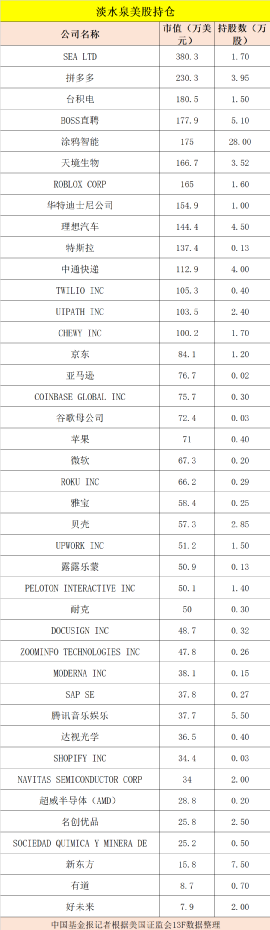 此外,淡水泉还持有BOSS直聘、涂鸦智能、天境生物、Roblox Corp、华特迪士尼公司、理想汽车、特斯拉、中通快递等美股上市公司,持股市值都在100万美元以上。