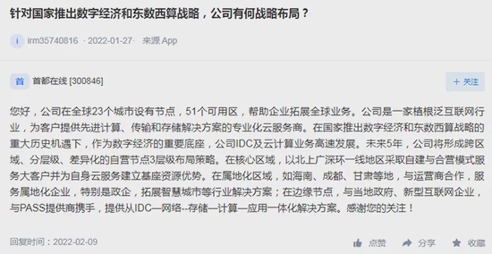 公开资料显示,首都在线主营云计算服务、IDC托管及IT增值、IT外包、通信集成等信息技术服务。公司日前在互动平台回复投资者提问时表示,公司在全球23个城市设有节点,51个可用区,帮助企业拓展全球业务;在国家推出数字经济和“东数西算”战略的重大历史机遇下,作为数字经济的重要底座,公司IDC及云计算业务高速发展。