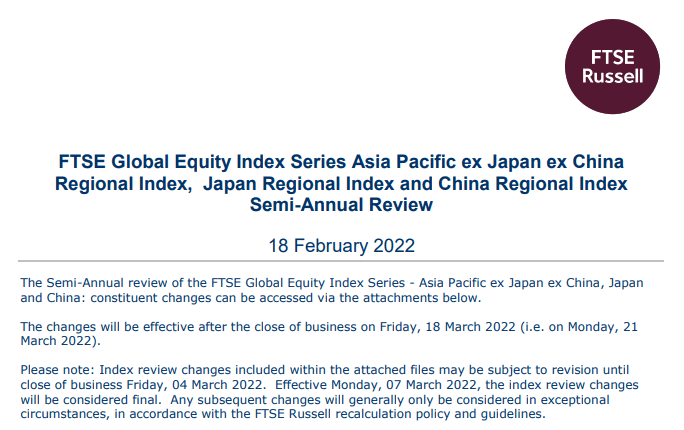 北京时间2月18日晚间,国际指数编制公司富时罗素公布了旗舰指数2022年2月的季度审议结果。
