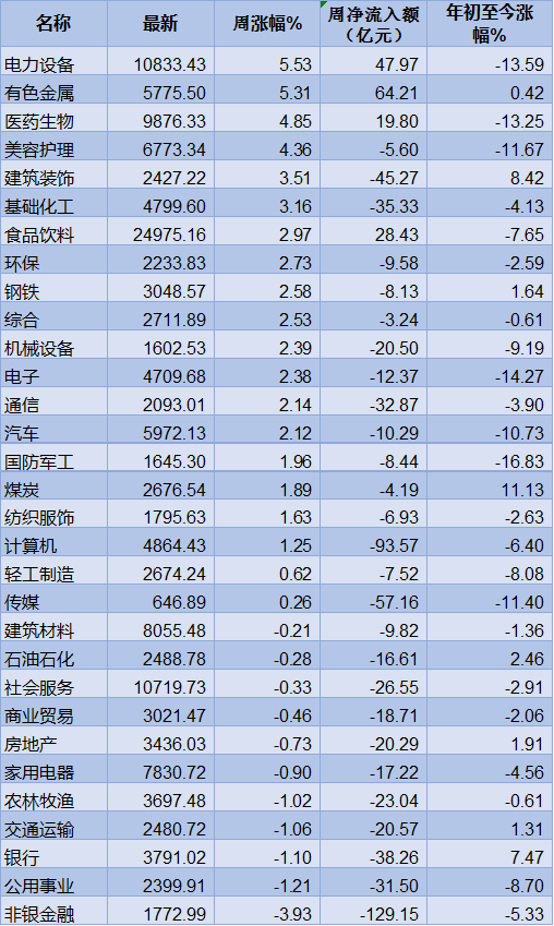 行业方面,本周31类申万一级行业中,有20类上涨,其中,电力设备与有色金属周涨幅居前,均超5%,11类下跌,非银金融跌幅居前。