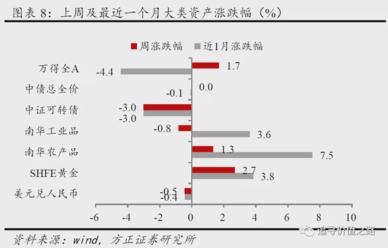 上周股票市场小幅回暖,农产品及黄金价格同样走强,工业品小幅下跌,人民币兑美元汇率小幅升值。具体来看,股票市场中,wind全A指数收涨,单周涨幅为1.7%。债券市场中,中债总全价指数和中证可转债指数分别下跌0.0%和3.0%。商品市场中南华工业品指数环比下跌0.8%,南华农产品指数涨1.3%。黄金价格上涨2.7%,人民币兑美元汇率小幅升值0.5%。