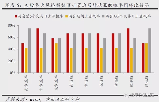 从各风格指数涨跌幅的绝对值数据来看,两会前低市盈率、亏损股表现较好,两会期间绩优股、低市盈率股相对占优,两会后高市盈率股、亏损股涨幅居前。具体来看,两会前5个交易日里中价股、低市盈率股、亏损股累计涨幅中位数分别为2.4%、1.8%和1.3%,大幅居前。两会期间绩优股风格累计涨幅中位数为0.2%,好于其他风格指数,此外低市盈率股风格同样相对抗跌。两会结束后5个交易日里中价股、高市盈率股和亏损股累计涨幅中位数分别为2.6%、2.3%和2.2%,相对占优。