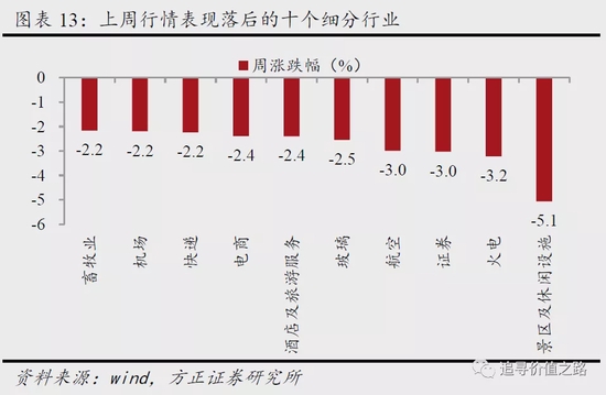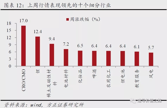 从我们筛选的110个细分行业来看,上周行情表现领先的前5名细分行业及周涨跌幅分别是CRO/CMO(+17.0%)、锂(+12.4%)、稀土及磁性材料(+9.4%)、电池材料(+7.2%)、化妆品(6.5%)。上周行情表现落后的后5名细分行业及周涨跌幅分别是景区及休闲设施(-5.1%)、火电(-3.2%)、证券(-3.0%)、航空(-3.0%)、玻璃(-2.5%)。