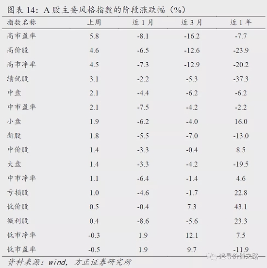 上周各风格指数普遍收涨,其中高市盈率、高价股和高市净率股风格表现较好,相对占优。具体来看,上周高市盈率、高价股和高市净率股风格指数涨幅分别为5.8%、4.6%和4.5%,涨幅居前,绩优股风格涨3.1%,表现次之。而低市盈率股风格指数单周下跌0.5%,表现垫底,低市净率和微利股风格表现同样靠后,单周涨跌幅分别为-0.3%和0.4%。
