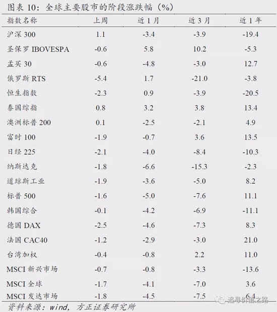 从全球权益市场来看,上周全球主要股票市场普遍下跌。具体来看,发达市场中美股标普500指数、道琼斯工业指数和纳斯达克指数全线收跌,单周跌幅分别为1.6%、1.9%和1.8%。欧洲市场中法国CAC40指数、德国DAX指数、富时100指数同样集体收跌,单周跌幅分别为1.2%、2.5%和1.9%。日经225指数、韩国综合指数单周分别下跌2.1%、0.1%,恒生指数跌2.3%,澳洲标普200指数涨0.1%。新兴市场中圣保罗IBOVESPA指数和孟买30指数单周均下跌0.6%,俄罗斯RTS指数单周跌5.4%,台湾加权指数单周跌0.4%。