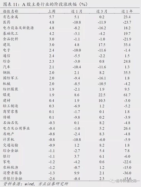 上周一级行业上涨略多,其中有色金属、医药、电力设备及新能源等行业领涨,而非银金融?消费者服务、农林牧渔等行业表现垫底。具体来看,上周有色金属行业上涨5.7%,表现居前。医药和电力设备及新能源行业均上涨4.8%,表现次之。而非银金融行业下跌2.6%,表现大幅垫底,消费者服务和农林牧渔跌幅次之,单周分别下跌1.3%和1.2%。