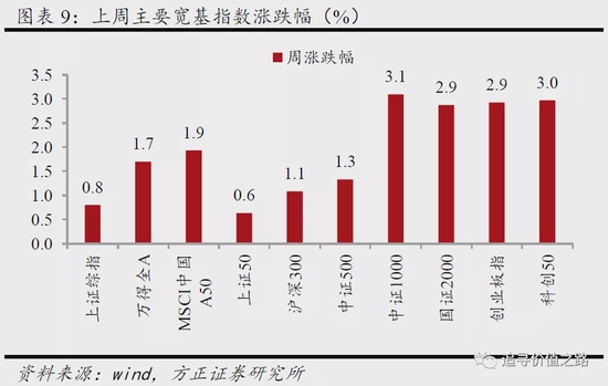 从主要宽基指数来看,上周中证1000、科创50等指数表现居前。具体来看,上周中证1000、科创50、创业板指等指数单周涨幅分别为3.1%、3.0%和2.9%,表现靠前。国证2000指数单周涨2.9%, wind全A涨1.7%,中证500和沪深300指数单周分别涨1.3%和1.1%,上证综指周环比涨0.8%,上证50指数涨0.6%,涨幅相对靠后。