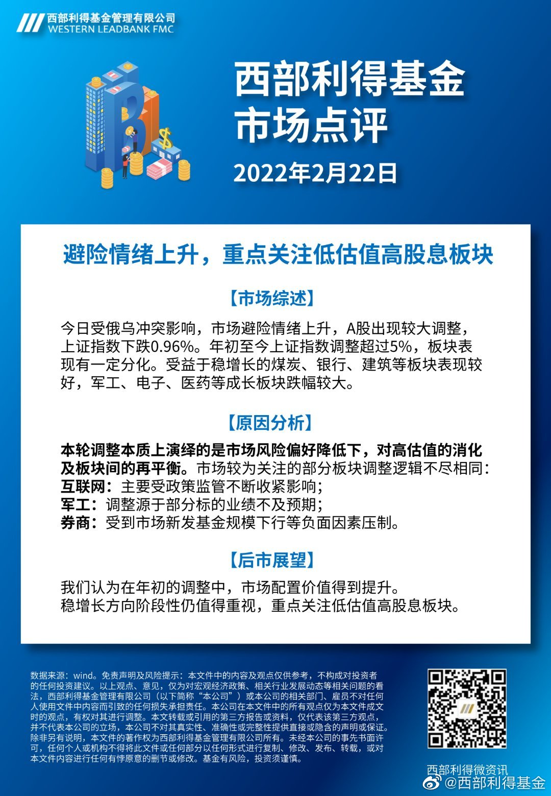 原标题:【西部利得基金2/22市场点评】避险情绪上升,重点关注低估值高股息板块