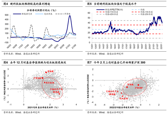 21年12月中旬以来(截至22/02/18)市场表现整体偏弱,前期热门的新能源、电子等行业调整明显,成长板块整体表现不佳,创业板指最大跌幅23%(下同)、电力设备及新能源24%、国防军工20%、电子19%,我们认为调整背后主要有三个原因:①热门成长板块前期涨幅较大,估值已经处于历史高位。本轮调整前(2021/12/13)中证新能车指数从低点到高点最大涨幅达99%, 2021/12/13新能源板块PE(TTM)达到了50.7倍,处于13年以来自下而上98%分位。②基金风格从偏成长转向偏均衡。21年公募基金对新能源等成长板块的配置力度持续加强,21Q3基金重仓股中新能源板块占比上升至22.2%,相对自由流通市值超配8.8个百分点。但近期从基金净值波动和指数涨跌幅来看,基金整体风格或正逐渐从成长向价值均衡。③美联储紧缩预期推高美债利率水平。历史规律显示,美联储加息初期A股往往会下跌,这是因为随着美联储开始加息,美国十年期国债利率中枢大概率上移,在全球经济同步性提升的背景下,我国国债利率也难以下行,从而制约A股估值。目前,A股成交缩量、龙头股补跌等盘面情况显示调整或已接近尾声,从价值到成长的风格切换正在发生。
