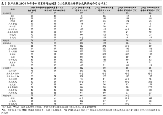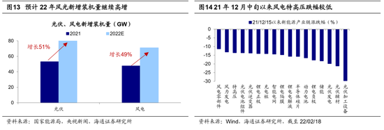 ①风电、光伏。参考已披露的2021年年报业绩预告及快报,风电细分子领域盈利水平最优,风电零部件21Q4/21Q3归母净利润两年年化累计增速为220%/88%,风电整机为111%/108%。风电光伏板块在新能源三大领域中盈利水平相对最优,21Q4/21Q3归母净利润两年年化累计增速为86%/65%,而新能源车为78%/44%。风电、光伏为代表的新基建正是当前稳增长政策的重要发力点,2022/2/18国家发改委等多部门在《促进工业经济平稳增长的若干政策的通知》提出实施好沙漠戈壁荒漠地区大型风电光伏基地建设,鼓励中东部地区发展分布式光伏,推进广东、福建、浙江、江苏、山东等海上风电发展,带动太阳能电池、风电装备产业链投资。根据中国能源报,第一批风光大基地项目总规模9705万千瓦,目前开工率超7成,22年一季度全数开工,并且第二批大基地规划已基本完成,总规模可能远超第一批。此外,目前多个沿海城市发力海上风电,例如浙江明确提出2022年全省海上风电开工100万千瓦,并网60万千瓦。根据海通电新分析师预测,2022年我国风电新增装机有望在71GW以上,同比增长约50%,2022年我国光伏新增装机有望达80GW,同比增长超50%。