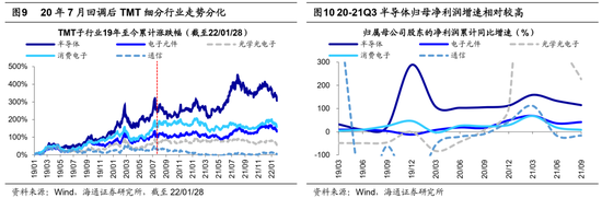 20年7月后TMT行业表现分化,电子持续高景气。19/01-20/07期间TMT板块各个细分行业的累计涨幅均较高,期间半导体累计涨幅达271%,电子元件116.4%,光学光电子74.0%,消费电子184.4%,通信33.6%;但在20/07板块迎来调整后细分行业的走势开始分化,其中半导体行业延续了前期的涨势,而消费电子、通信等行业则是维持震荡,20/07-22/01期间半导体涨幅10.3%,电子元件7.7%,而光学光电子(跌10.0%,下同)、消费电子(9.0%)、通信(21.8%)则下跌。细分行业走势分化的背后主要源自基本面的差异,可以发现2020年半导体为TMT板块中景气度最高的方向,同时在21年也维持了较高的盈利增速。20年在疫情影响下,全球缺芯问题持续发酵,半导体迎来了新一轮景气周期,根据ESM援引IC Insights的数据,2020年全球半导体销售额为4926亿美元,较19年增长11%。需求扩张带动行业整体资本开支扩张,半导体全产业链持续高景气,20年行业盈利维持高增。20Q3归母净利同比达105%,高于电子元件的17%、消费电子的24%、通信的-9.2%;20Q4半导体盈利继续高增、达113%,高于电子元件的49%、消费电子的29%、通信的44%。
