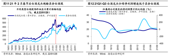 21年春节后白酒板块内部分化,同样源自基本面的分化。2020年以白酒为代表的食品饮料板块涨幅较大,例如疫情之后低点(2020/3/19)至调整前最高点(2021/2/18)中证白酒指数最大涨幅达234%,食品饮料板块整体市值占全部A股的比例上升到了9.8%。2021/2/10白酒板块PE(TTM,下同)达到63.0倍,处于13年以来自下而上100%分位。20Q4公募基金重仓股中白酒板块的持股占比上升到了15.8%,相对自由流通市值超配9.5个百分点。同时2021年2月食品饮料板块成交额占全部A股的比例也上升到了6.4%的高位。其中,龙头白酒(贵州茅台、五粮液、泸州老窖)涨幅更大,20/03-21/02期间龙头白酒平均上涨247%,其余小市值白酒平均上涨177%,但21年春节后回调以来白酒行业内部走势开始出现分化,其中贵州茅台、五粮液和泸州老窖这些龙头白酒明显回调,而其余市值相对较小的白酒股却较早结束调整并迎来上涨:21/03-22/01期间,龙头白酒平均下跌9.7%,其余小市值白酒平均上涨30.2%。白酒行业表现分化的背后同样是基本面的分化,21Q1龙头白酒归母净利润累计同比为18.2%,低于其余白酒的269.9%;21Q2龙头白酒为20.6%、其余白酒为57.7%;21Q3龙头白酒为19.9%、其余白酒为28.5%。