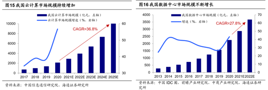 ①云计算。“东数西算”工程已在全面推进,要求发展数据中心集群,开展数据中心与网络、云计算、大数据之间的协同建设。政策支持下,我国云计算市场规模或将高速发展,根据中国信息通信研究院《云计算白皮书》,2020年我国云计算整体市场规模达2091亿元,同比增长达到56.6%,预计“十四五”末市场规模将突破10000亿元,20-25年期间年复合增速将高达36.8%。从基本面看,数字经济景气度较高,参考已披露的2021年年报业绩预告及快报,各细分行业中云计算板块业绩相对表现最为突出,21Q4/21Q3归母净利润两年年化累计增速为41%/-6%。
