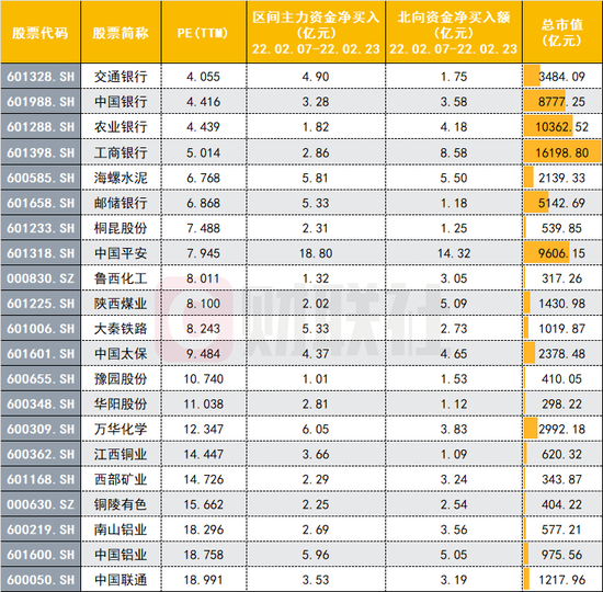 财联社梳理了市盈率PE(TTM)在20以内,虎年获主力资金和北向资金同时增持超亿元的个股。