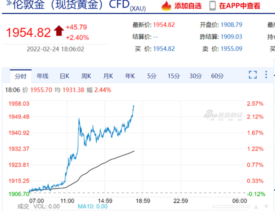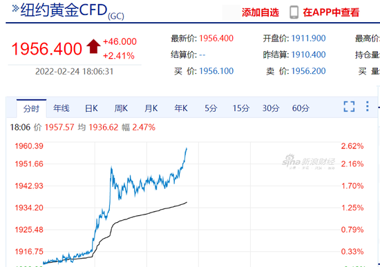 黄金方面,截至发稿,现货黄金上涨2.4%至1954.82美元/盎司;COMEX期金主力合约上涨2.41%至1956.4美元/盎司。