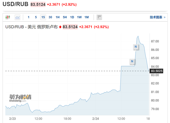 另,俄罗斯卢布汇率大幅走低,卢布对美元汇率一度大跌9%,此后跌幅有所缩小,截至发稿卢布对美元汇跌3%,报83.5。