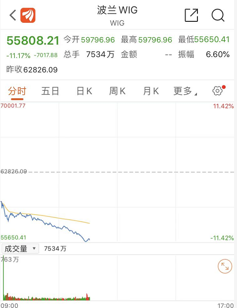 欧洲各国股市中,波兰股市跌幅最大,截至发稿,波兰WIG指数大跌11%。