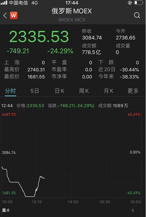 当天俄罗斯MODEX指数最大跌幅超45%,跌幅创纪录新高,截至发稿,跌幅缩小至24%。