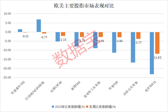 乌克兰方面,乌克兰央行宣布暂停外汇市场。本周以来,俄罗斯RTS指数跌近12%,开年以来跌幅超过23%,乌克兰股票指数本周跌3%以上。美国股指也受到了影响,三大股指开年以来跌幅均超过10%,美股上市公司本周市值蒸发合计近1.8万亿美元。