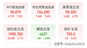 受俄乌局势影响,今日国际市场方面,WTI原油日内涨幅超7%,布伦特原油期货价格今日盘中突破每桶100美元,为7年多来首次破百,涨幅一度接近8%。伦敦金属交易所(LME)期铝价格创历史新高,触及3388美元,超过2008年的峰值。