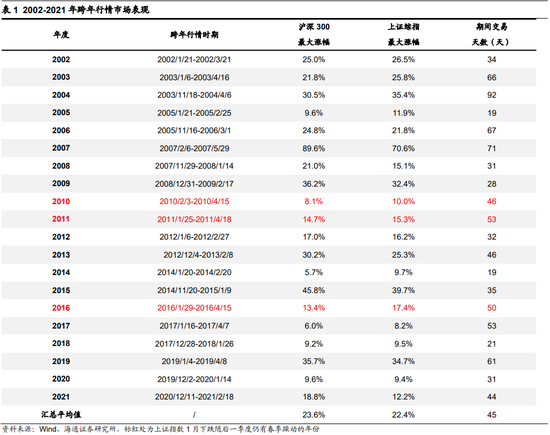 二是回顾历史后发现,过去20年里A股春季行情从未缺席,背后的原因源自于岁末年初往往是重大会议召开时间窗口,同时11月到3月A股基本面数据披露少,且年初资金利率通常有所回落,开年投资者的风险偏好相对更高。历次春季行情期间沪深300和上证综指的平均最大涨幅分别为24%和22%(详见表2)。且10、11、16年时上证指数均经历了与当前市场类似的1月下跌,但是这三次下跌后一季度指数均会回升。