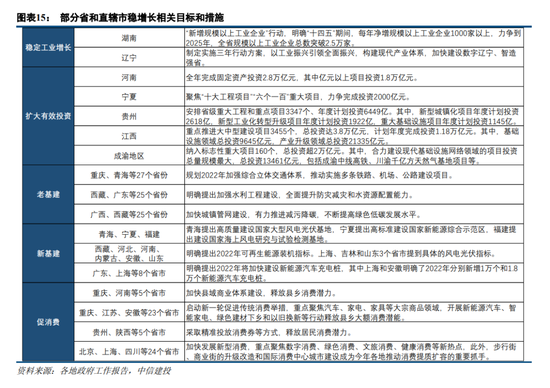 在2022年地方两会提到的发展任务中,“稳增长”仍是重中之重。其中,投资、消费、产业升级等作为“稳增长”着力点的重要性显著提升。除此之外,改革开放、区域协调、共同富裕等也是“稳”的保障,在各地政府工作报告中得到了比以往更多的强调。本月25日召开的政治局会议再次强调“要加大宏观政策实施力度,稳定经济大盘”,据了解近期货币、财政及工业、服务业主管部门均表示要加大政策力度,稳增长政策仍有发力空间。