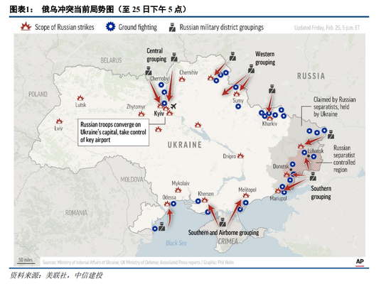 当地时间24日清晨,俄罗斯方面在顿巴斯地区发起特别军事行动。俄乌局势迅速恶化,战争规模不仅局限于乌东边境的摩擦冲突,明显超出市场此前预期,当俄罗斯兵锋直逼基辅、哈尔科夫、敖德萨等乌克兰主要城市,世界开始认识到俄罗斯有着更加深远的战略意图。当地时间2月26日,俄罗斯国防部发布最新公告表示,俄罗斯武装部队已使821个乌克兰军事基础设施瘫痪,其中包括14个军用机场,19个指挥所,24个S-300和“奥黄蜂 ”防空导弹系统以及48个雷达站。此外,俄军共击落7架作战飞机,7架直升机和9架无人机,摧毁87辆坦克和装甲战车,28台多管火箭炮,118辆特种军用车辆以及乌海军的8艘军用船只。