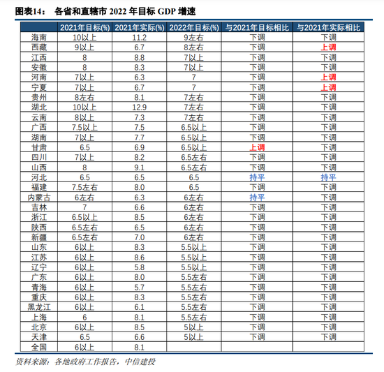 在已公布政府工作报告的31个省和直辖市中,同2021年实际增速相比,有3个省份上调了今年经济增长目标,1个省份持平,其余27个省市均下调目标。其中,海南省2022年的预期增长目标达到9%,高增速目标的设定主要源于海南省自贸港建设红利不断释放,旅游和零售等消费行业蓬勃发展。