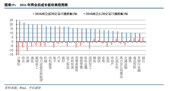 2015年底我国提出推进供给侧结构性改革,在经历了2015下半年的股灾和2016年初的熔断后,2016年两会召开前一个月左右时间里,市场表现相对较好的行业多集中于具备行业格局和业绩改善预期的上游周期性行业,以及具备防御性并受到外资偏好的消费和金融板块。而2016作为十三五计划的开端之年,政府工作报告强调“创新是引领发展的第一动力,必须摆在国家发展全局的核心位置”,提出要促进大数据、云计算、物联网广泛应用,TMT板块在两会后一个月左右时间里领涨市场。