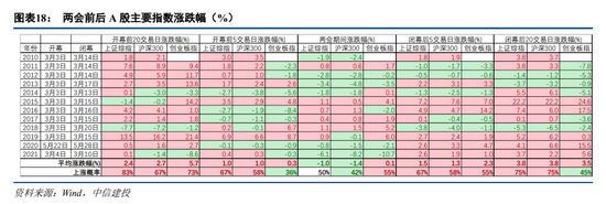 2010年以来,A股主要指数在两会前的一周和一个月里,整体上来看涨多跌少,但在两会召开期间随着政策逐步落地,投资者可能出现筹码交换或兑现了结的情况,市场出现调整的次数也相对较多,两会闭幕后政策主线逐步清晰,市场重拾涨势。