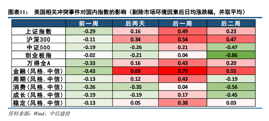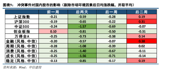 总的来看,冲突事件发生前后一周都会造成国内股市普遍下跌,冲突发生后两天内对国内股市负面影响最大,剔除市场环境因素影响,上证指数日均下跌0.59%,沪深300日均下跌0.65%,但负面影响持续时间较短,大约1~2周市场企稳,中证500和创业板指跌幅收敛,上证指数、沪深300和万得全A则触底反弹。